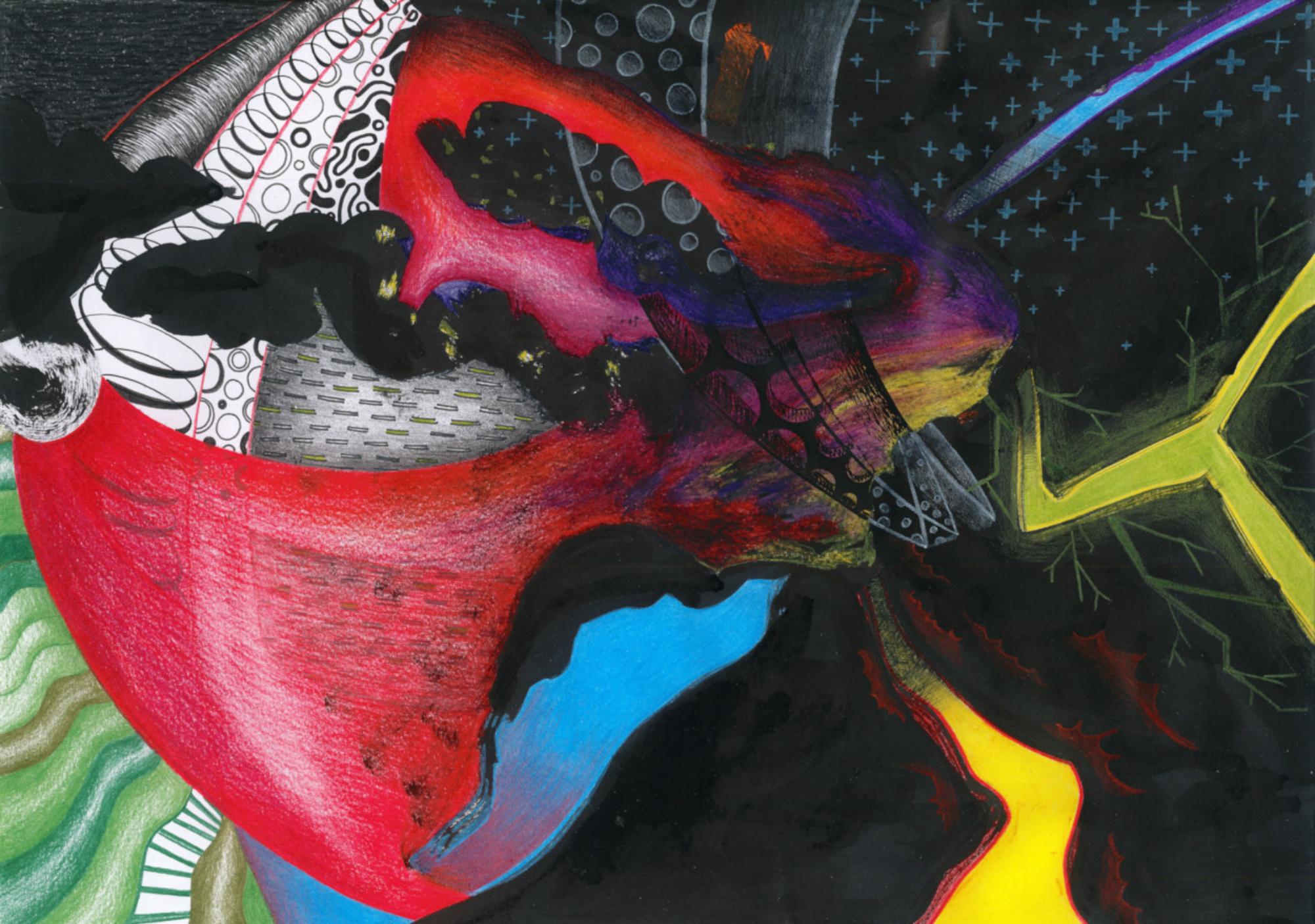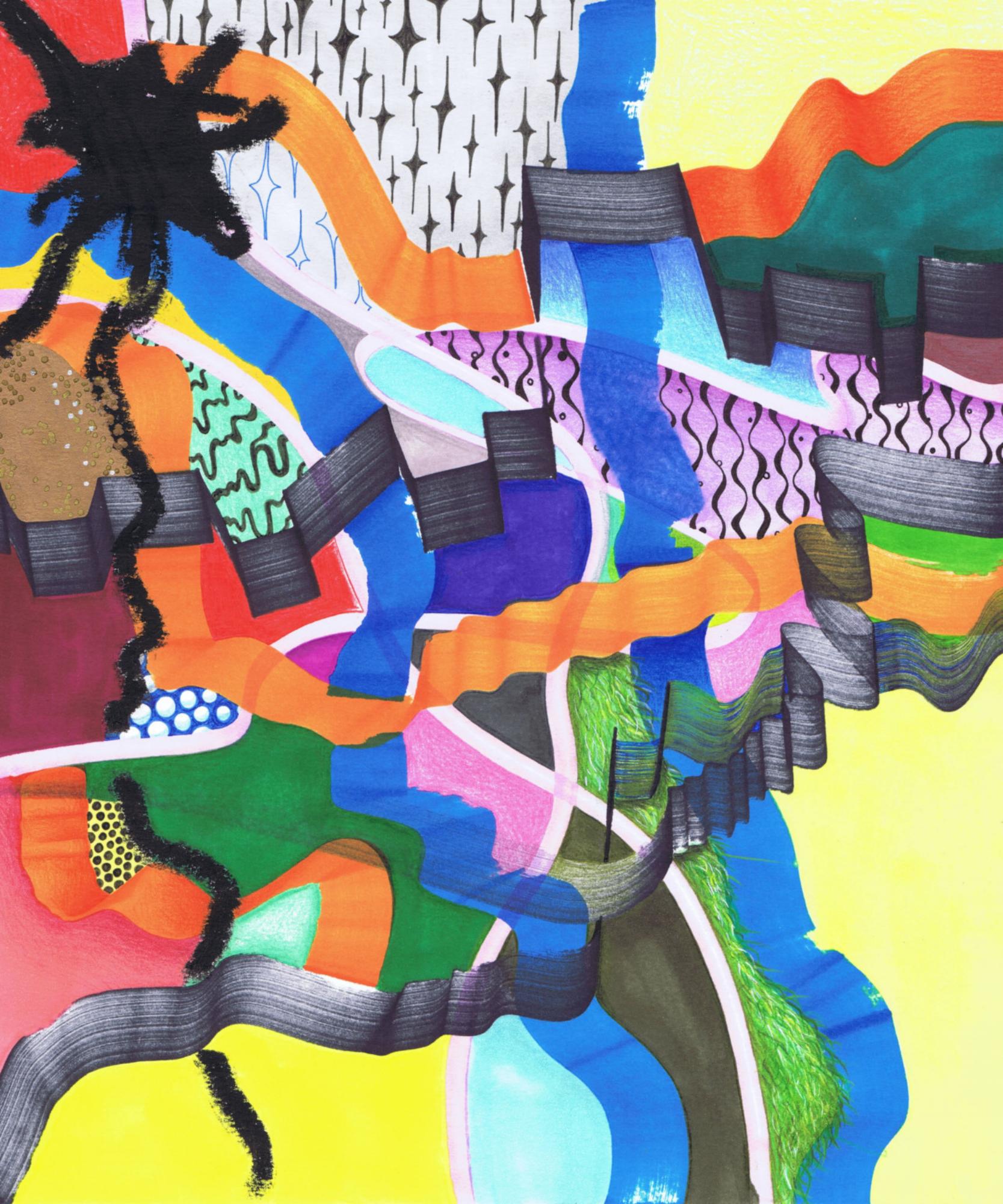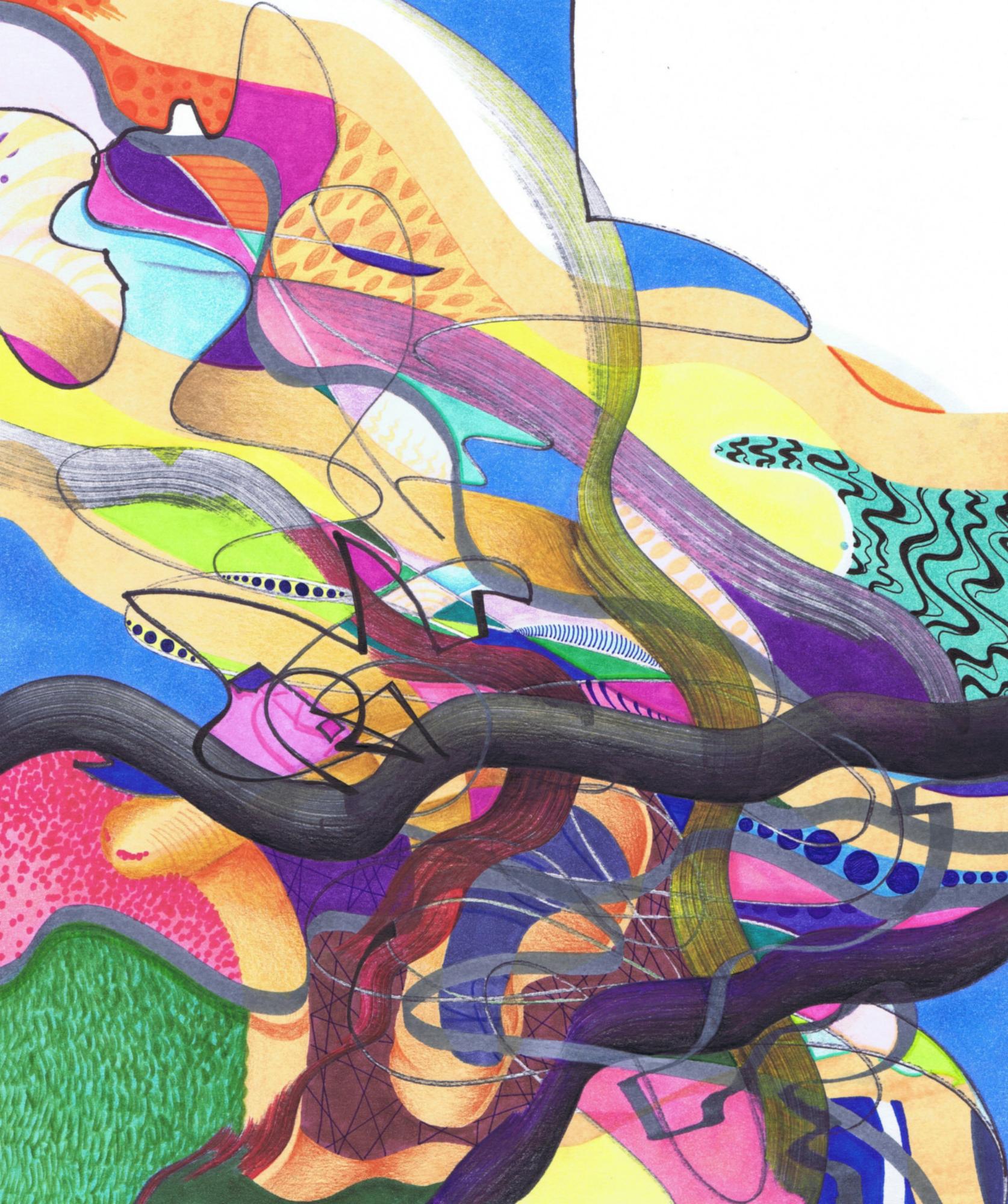 Handzeichnung in Mischtechnik (Marker, Fineliner und Buntstifte) auf Papier_2024_31,3x29,7cm Gewinner Christine Dobler Grafikpreis 2024