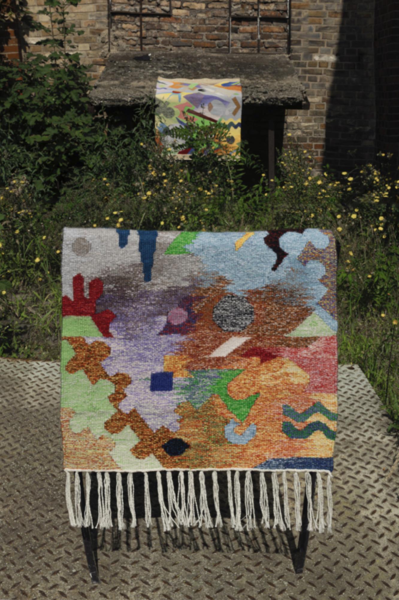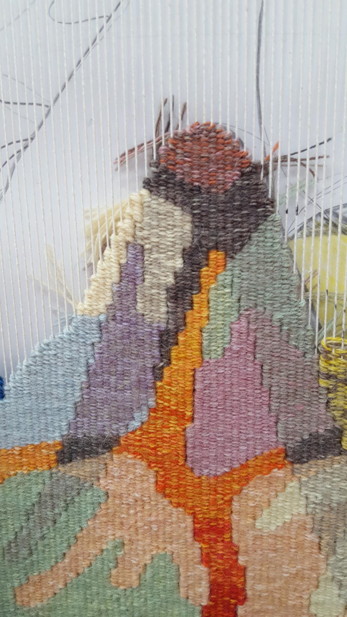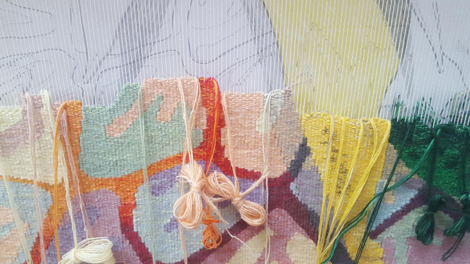 Beim Weben wird jeder Faden bewusst gesetzt, die Fläche und das Bild bauen sich von unten nach oben auf. Deshalb wirkt der Teppich nach der Fertigstellung nicht nur als Bild, sondern bietet von Nahem viele Details, die von seiner Entstehung erzählen.