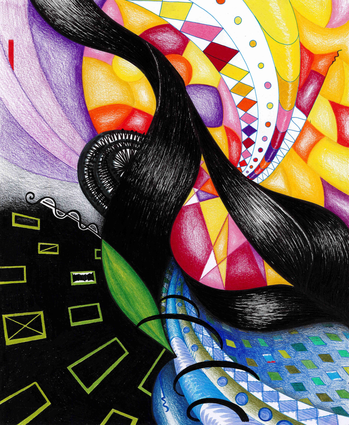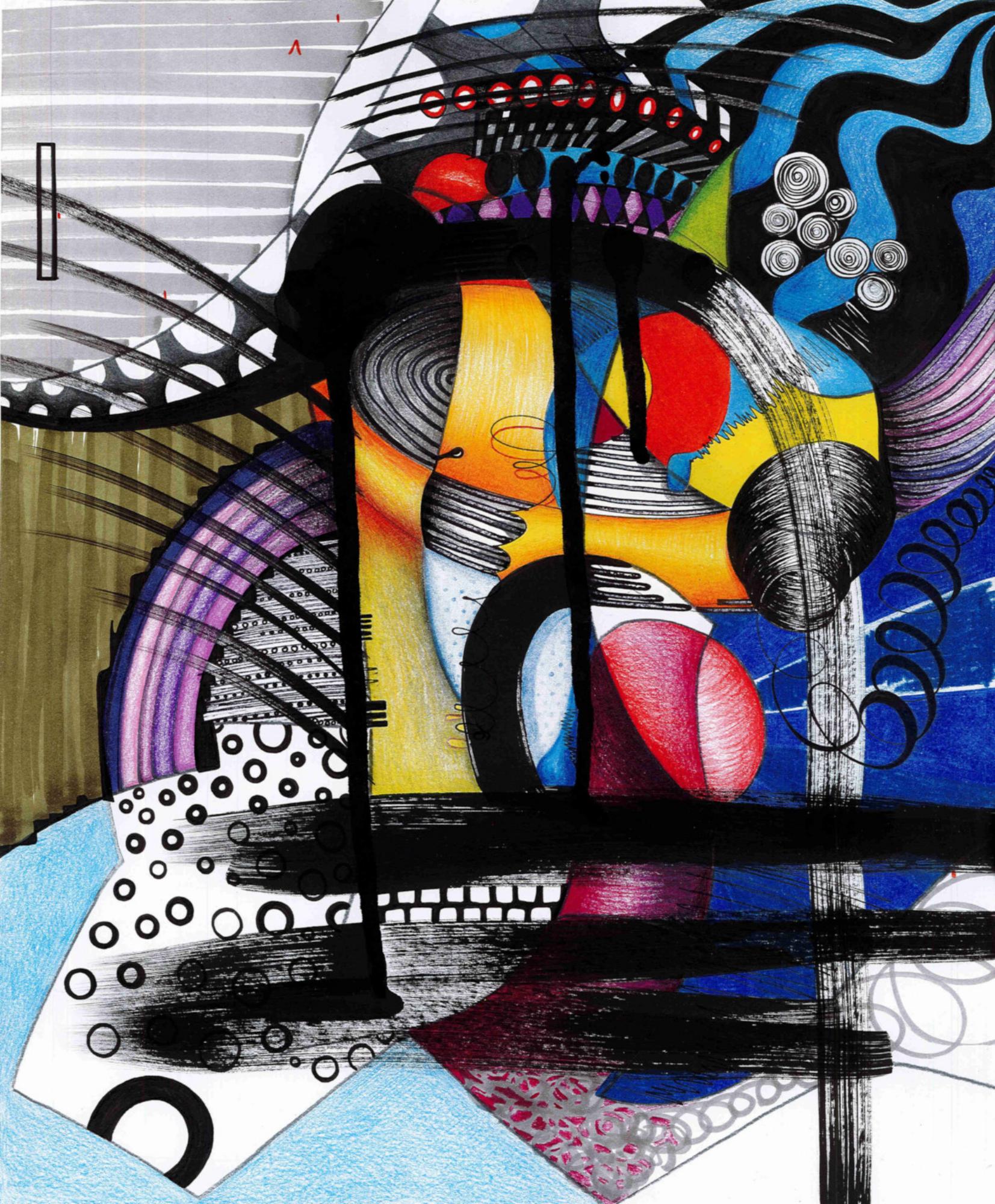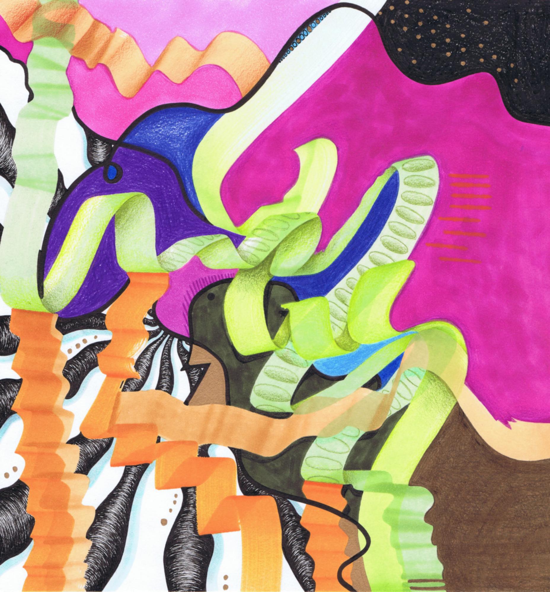 In meinen Zeichnungen verarbeite ich die flüchtigen Eindrücke, die mir im Alltag begegnen. Wann immer mir also etwas in meiner Umgebung auffällt, versuche ich es in einem spontanen Foto oder einer Skizze festzuhalten. Diese Momentaufnahmen dekonstruiere ich später und suche mir das heraus, was meine Aufmerksamkeit das erste Mal gefesselt hat. Das kann eine bestimmte Form, eine Kombination von Objekten oder eine einzelne Farbe sein. Dieses identifizierte Element bildet dann den Ausgangspunkt für eine meiner abstrakten Bilderwelten. Ich verbinde es mit anderen Bildelementen, Musterungen und Kontrasten, um das Maximum aus meinem neuen Element herauszuholen. Mein Ziel ist dabei, eine einzigartige, spannungsreiche Komposition und ein ansprechendes Gesamtbild zu erschaffen.